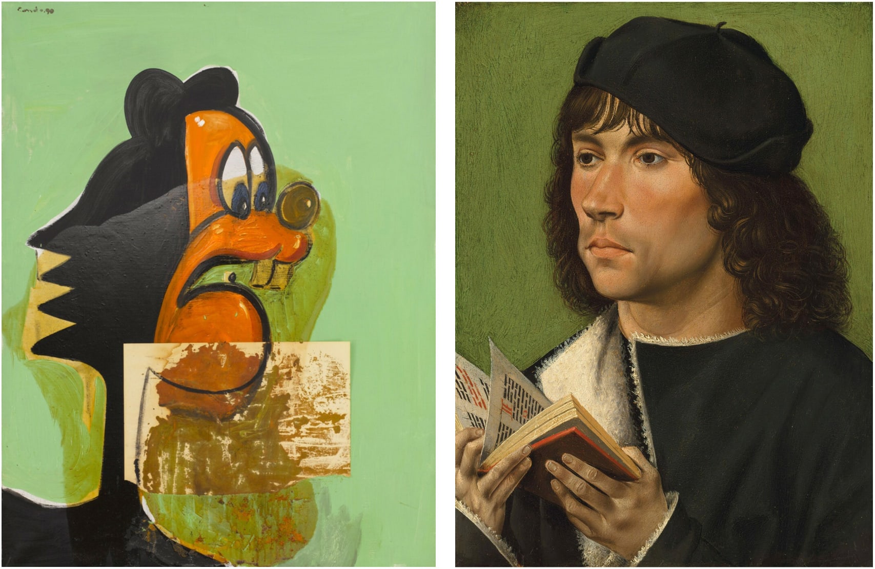 In continuity with his earlier series of “fake Old Masters” from the early 1980s, each segment of Crazy Cat Combination is infused with allusions to various artistic styles and imagery, including traditional classical portraiture. As both a connoisseur and an inheritor of these diverse artistic languages, Condo draws on their recognizable palettes and techniques, reshaping and distorting them through his own distinctive lens.